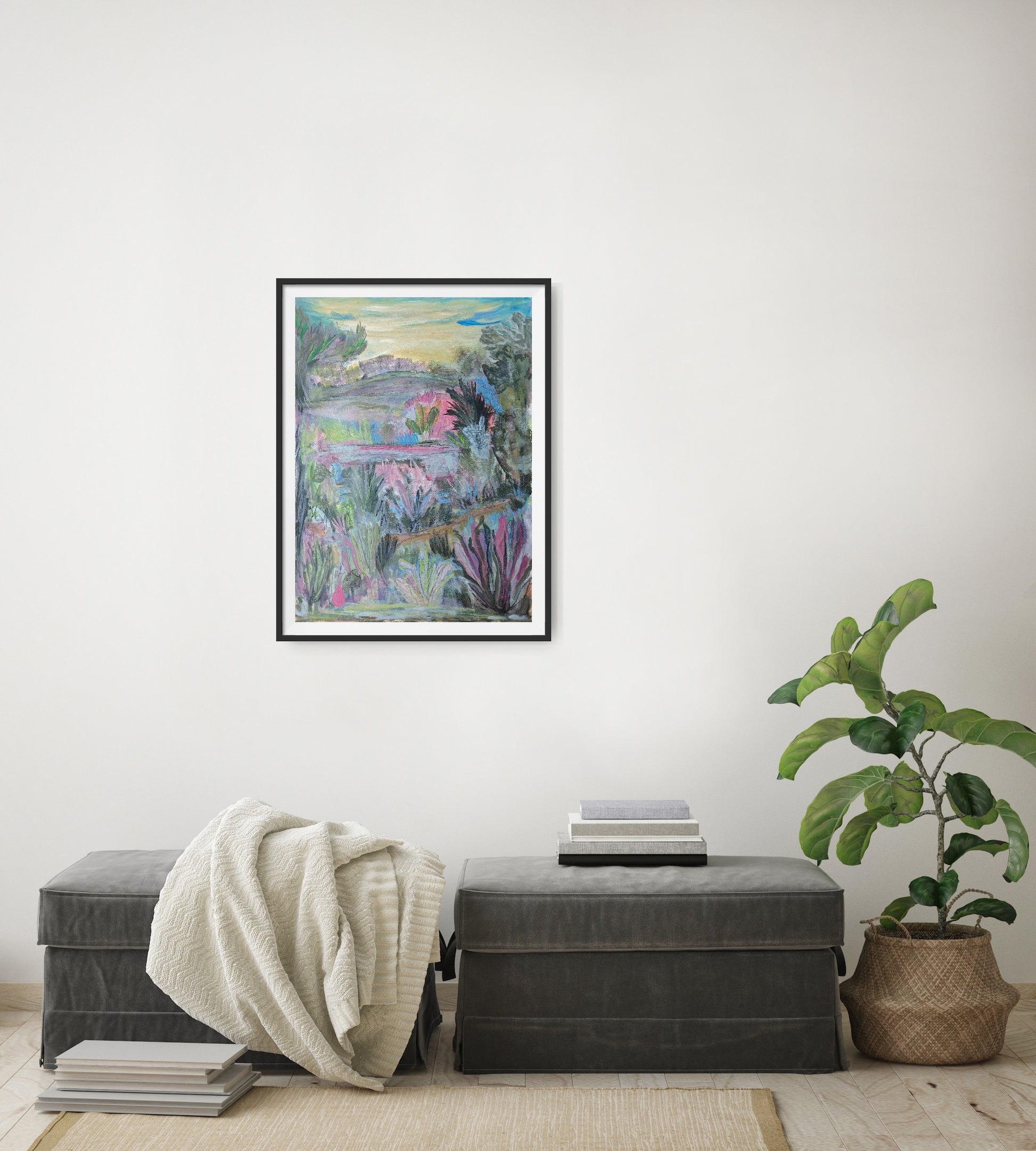 Katie frequently explores the picturesque English countryside with her children and dog. This piece showcases her experimentation with color and expression using mixed media such as watercolor crayons, layered acrylic paint, pencil, and charcoal. The study plays with form and line to create a compelling conversation starter. It conveys a sense of playfulness while capturing an atmosphere of beauty and mystery that invites further reflection on this unique landscape. Presented unframed, the 22" x 30" artwork on 300gsm fine art paper is sealed with a protective medium to prevent smudging. It is signed by the artist, includes a certificate of authenticity, and is carefully rolled and shipped in a protective tube. Additional shipping charges will apply.