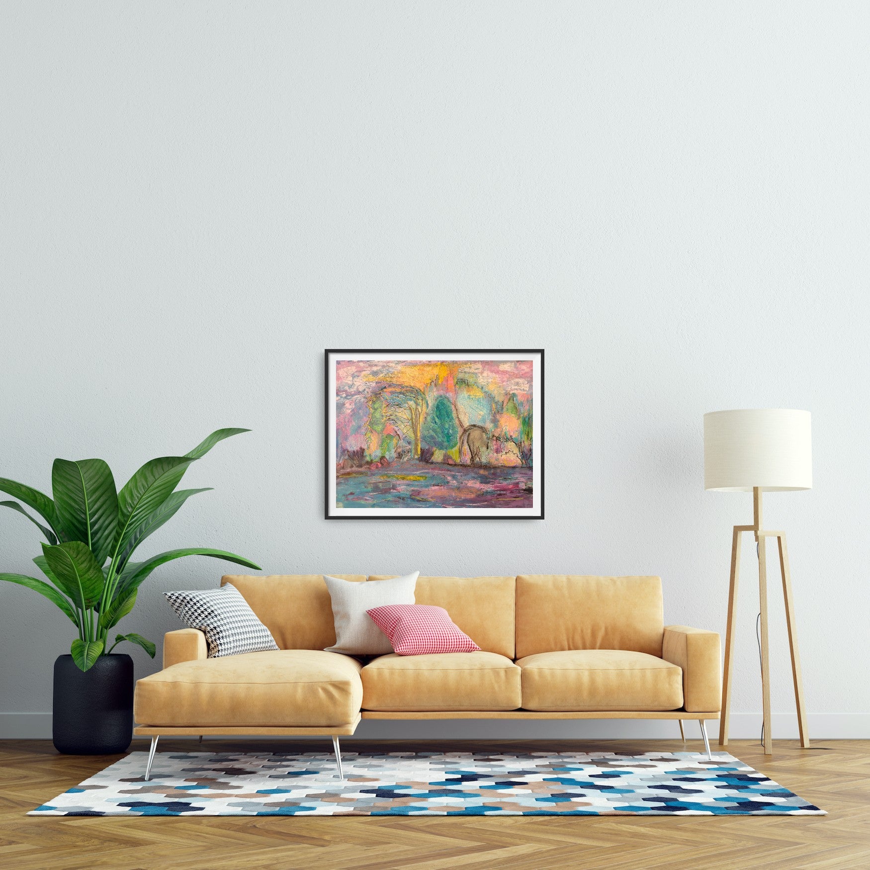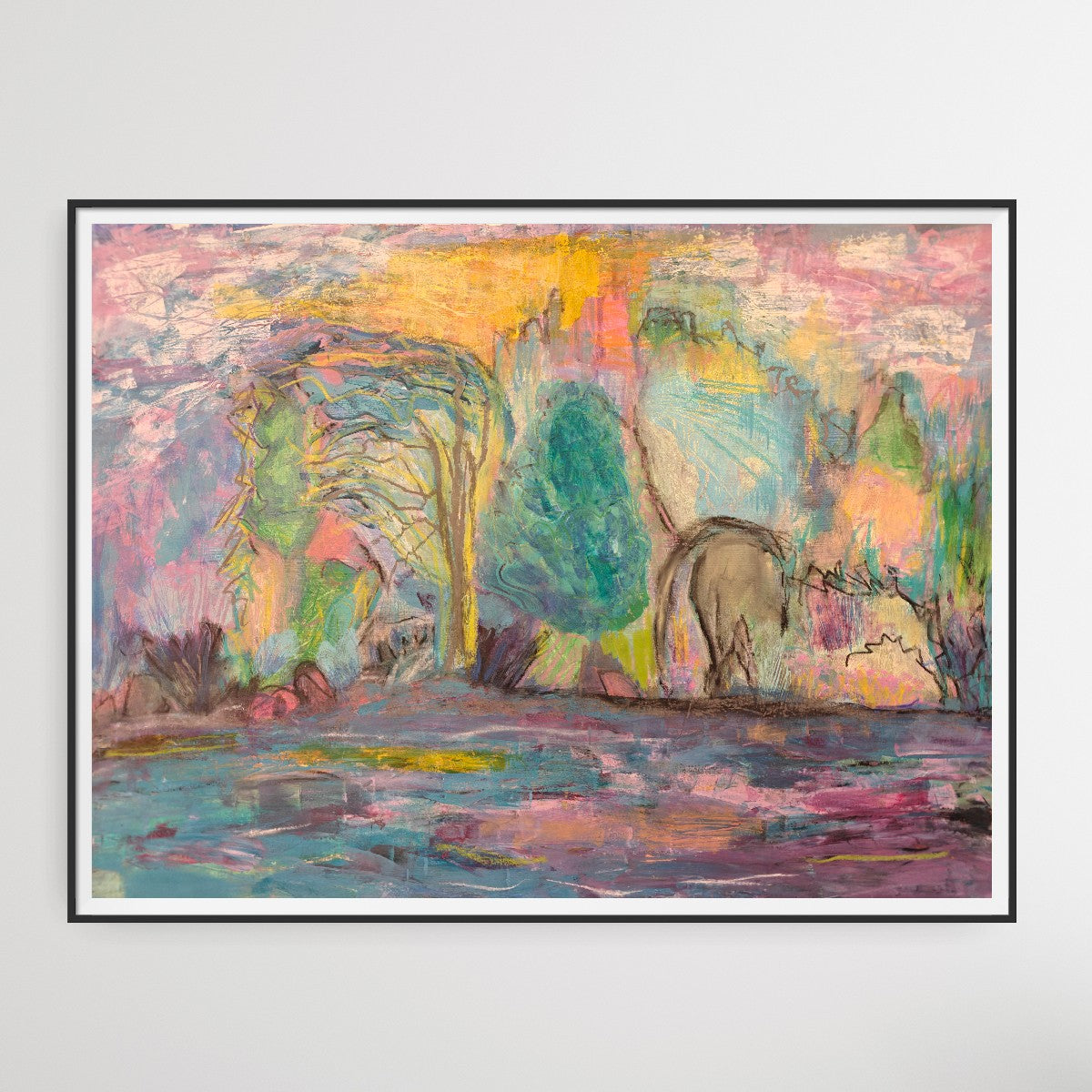 Introducing Bath Landscape - Study #3, a stunning mixed media landscape that explores the abstract use of color in a playful way. Measuring 30" x 22", this piece is sold unframed and may require additional shipping costs. Elevate your space with this unique and dynamic work of art.