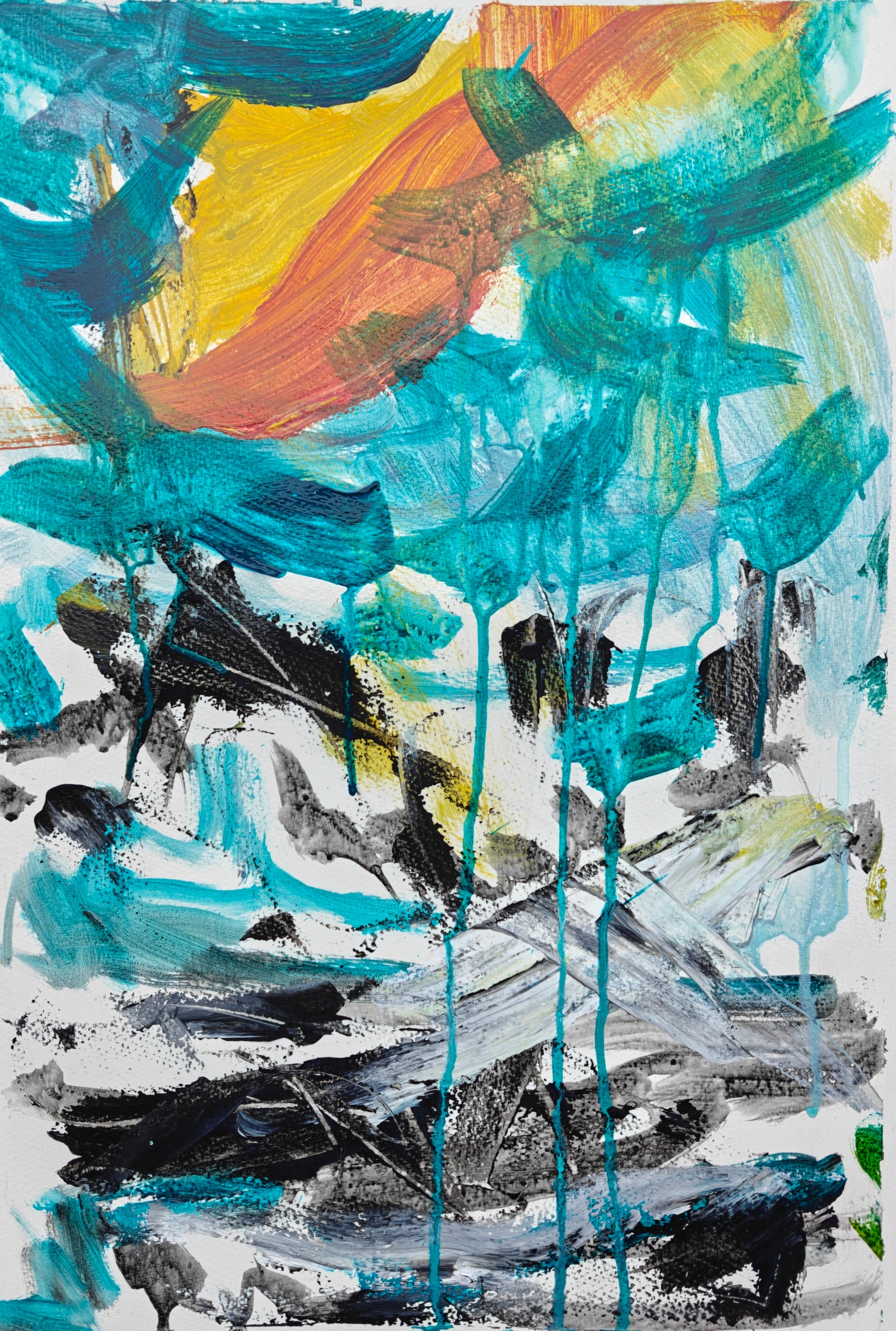 "Birds" emerged from a class assignment focused on creative freedom and personal expression. The piece remains raw, genuine, and untouched. Inspired by Bon Iver's song Skinny Love, it captures the mood of the music. Its title was given by Katie’s husband, who frequently names her artworks after seeing birds soaring in the sky. This name reflects the essence of freedom in expressing ourselves openly.