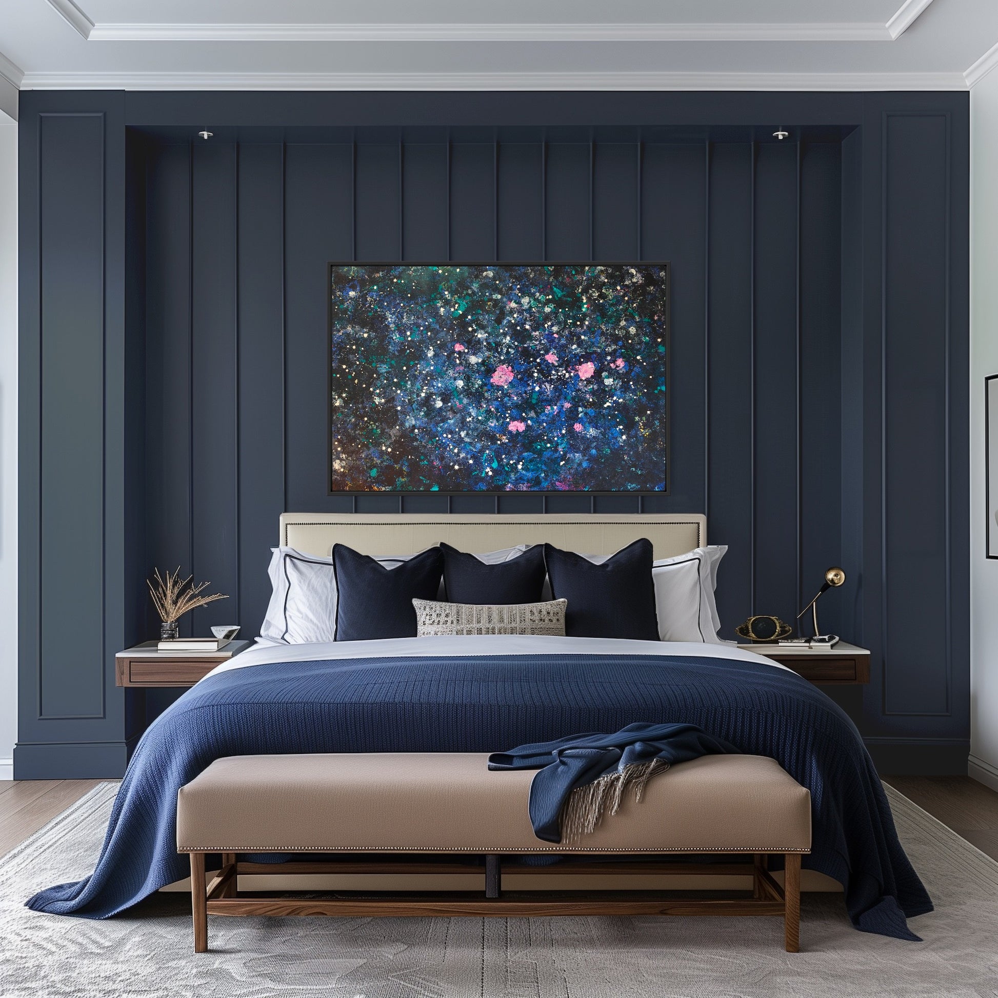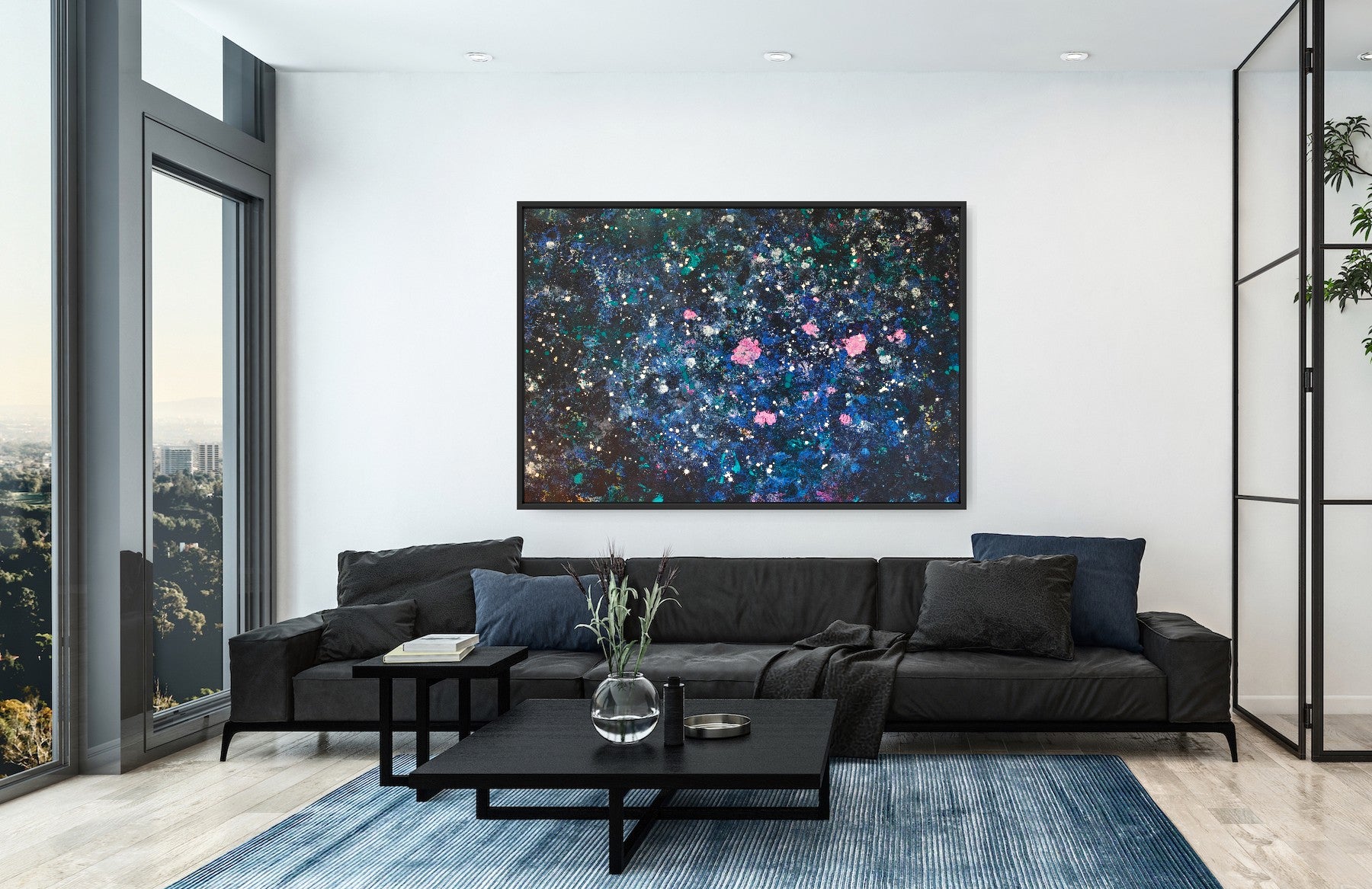 This artwork is the inspiration for an entire collection. Think a starry night sky meets flowers and petals and you'll understand the unique paring of these visual elements. Very captivating and a true conversation starter. Truly it's an opportunity to own a unique, one-of-a-kind piece.