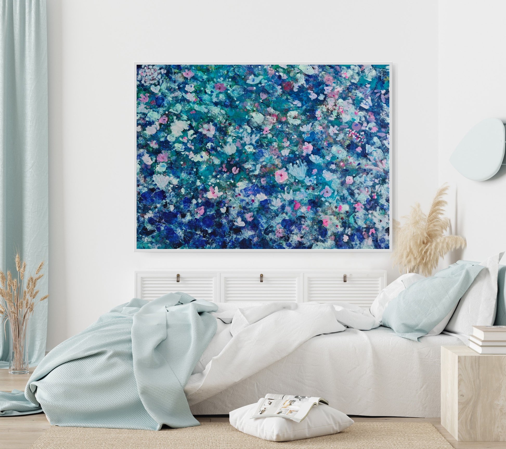 It's a larger size painting at 60" x 40", would make a dreamy addition above a bed, or could be perfectly placed about a large sofa, really beautiful decor for any space where you want to invoke peaceful beauty.