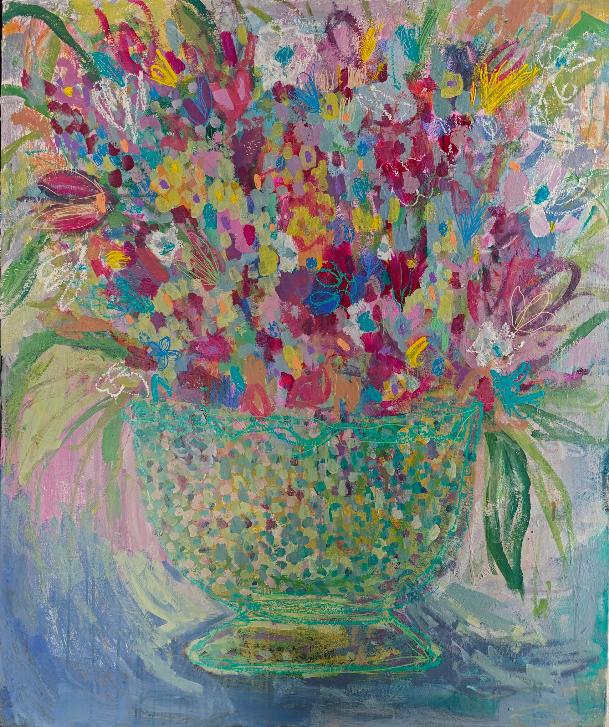 This beautiful bouquet in a green milk glass frilly edged vase holds tremendous sentiment for Katie. When she was a little girl she used to spend a lot of time in the garden with her grandmother. Her grandmother also a painter, had an art studio, in which she used to let Katie paint. Joyful memories of summers in the garden and painting in the studio with her grandmother, Oma.