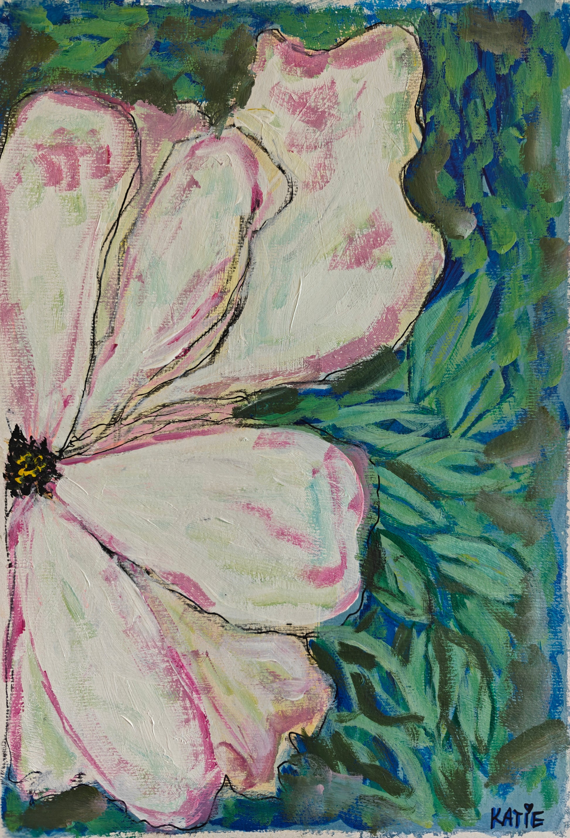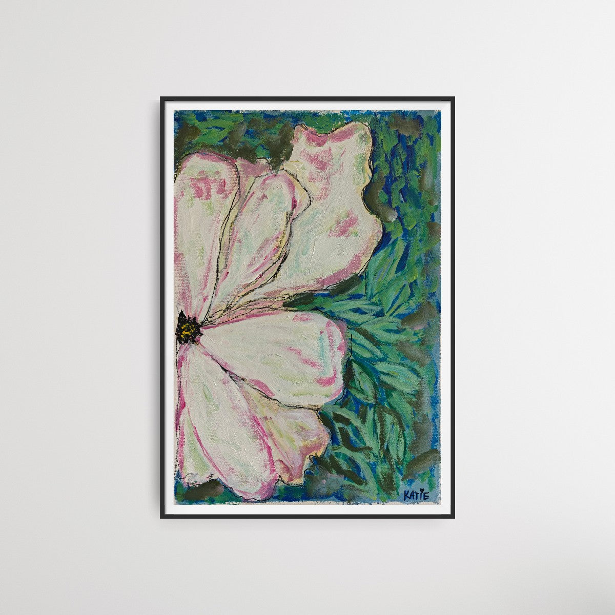 This floral study measures approximately 12" wide by 16" high and was created using mixed media on 300gsm fine art paper. Rendered in an impressionistic style, the artist explores expressive lines before enhancing the work with a second layer, deepening its impressionistic qualities. The work can be shipped or collected directly from Katie's studio in Bath, UK.